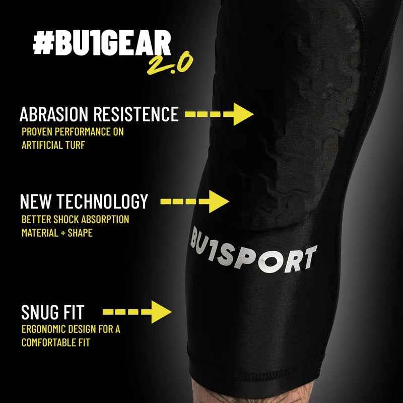 The reinforced BU1 goalkeeper leggings 3/4 2.0 protect knees, thighs, and hips. Better impact absorption, larger protective area, and a stable waistband.